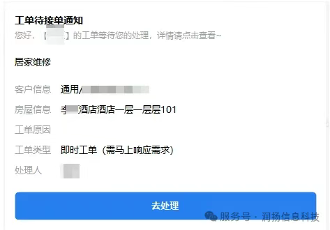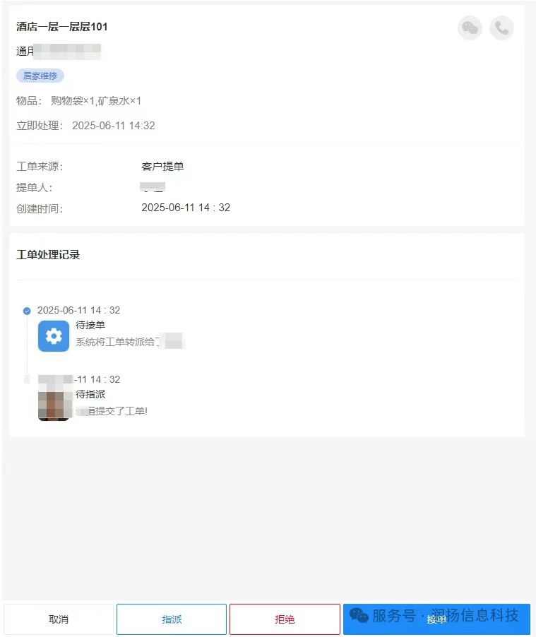 员工收到工单提醒后,可立即在企微上接单。接单后,员工能清晰看到工单详情,包括客户诉求、房间位置等关键信息。在处理过程中,员工可随时更新工单状态,如“处理中”“已完成”等,让前台和客户都能实时了解处理进度。